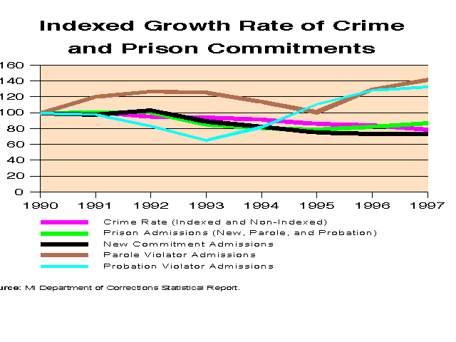 Throughout the 1990s, in terms of prison, parole, and probation population size, Michigan has been among the leading states in the country. Yet, the states surrounding Michigan have experienced acute growth in their corrections systems during the decade, while Michigan's corrections system growth has been more measured. Even though Michigan's growth is slower than the growth in the surrounding states, Michigan's prison population has outpaced the prison system capacity available to house the population.