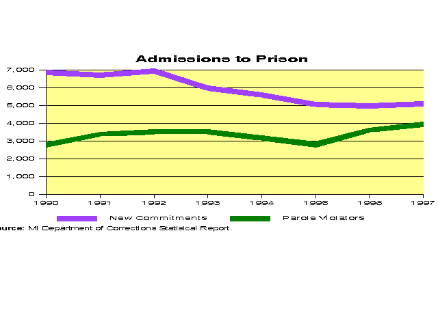 The admissions of parole violators with new sentences seemed to decline when a 1993 ruling by Wayne County's Recorders Court required a parolee to complete the full maximum sentence for the original crime, as well as the minimum sentence for the new crime. Since the overturn of that ruling in 1996, admissions of parole violators with new sentences have increased. Prison admissions of all parole violators increased even during the period the ruling was in effect, suggesting that parole violators who would have returned to prison with new sentences prior to the ruling, were probably returned to prison as parole technical rule violators as a result of the ruling.